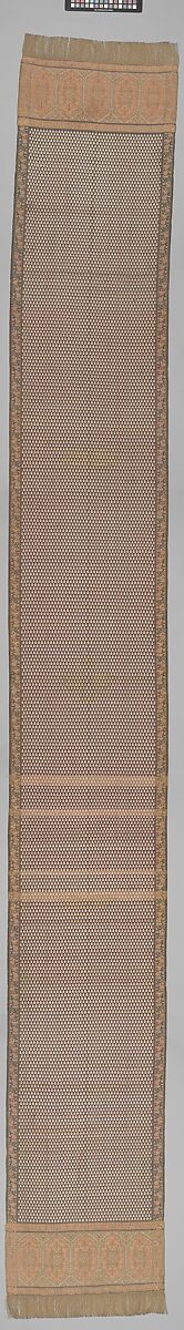 Sashes like this one became popular in seventeenth-century Iran, where they were tied around the waist with the ends hanging down. The arrangement seen here is a common design, consisting of two end panels containing stylized and elaborate floral motifs, with a simple repeating motif in the central field. Persian sashes were exported and became particularly popular in Poland, one of Persia’s trading partners, where they were worn as accessories by the wealthy elite. The popularity of the sashes eventually prompted the founding of a number of textile workshops in Poland that produced local variations of the Safavid originals.
