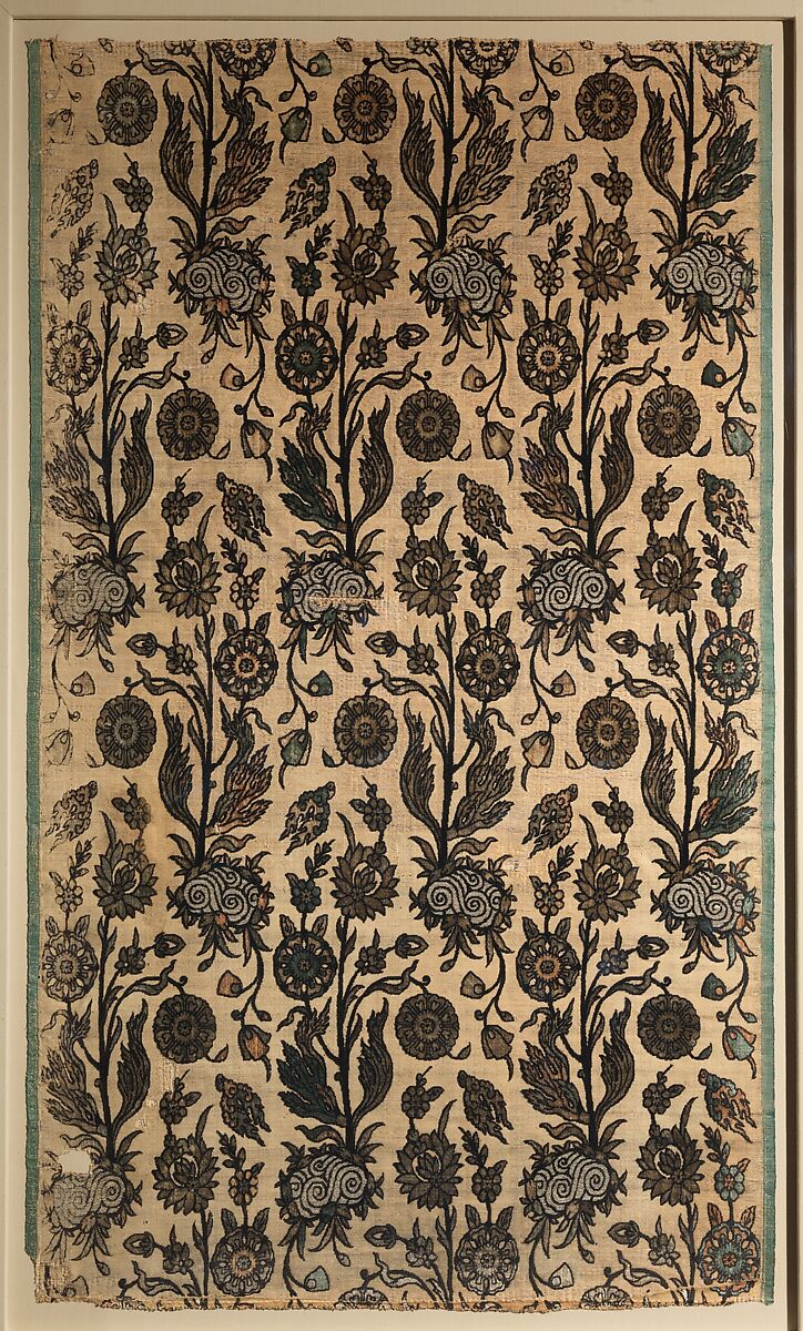 During the seventeenth century, rows of flowering plants became fashionable designs for textiles in Iran, India, and Turkey. In this example, the plants are fantastic conglomerations of blossoms growing out of pools of coiled waves. The serrated edges of the leaves may show the influence of the so-called saz style popular in Turkey at the same time. Safavid weavers of this period were particularly adept at obscuring the junctions where pattern-repeat units meet, creating the sense of a continuous composition. Safavid velvets were among the finest fabrics sold on the international market and were popular in Iran.