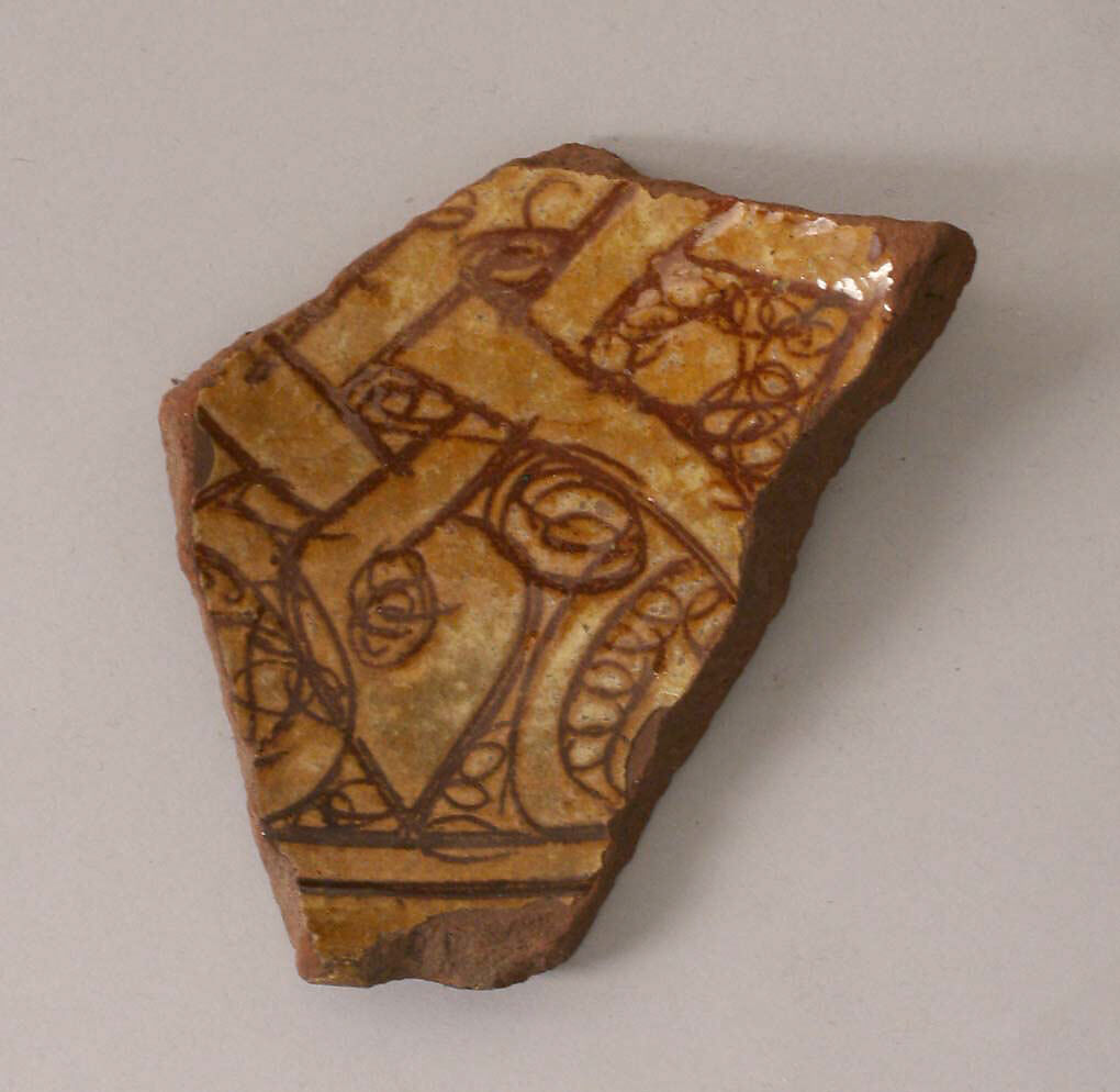 - Medium: Earthenware; incised decoration through white slip and coloring under transparent glaze