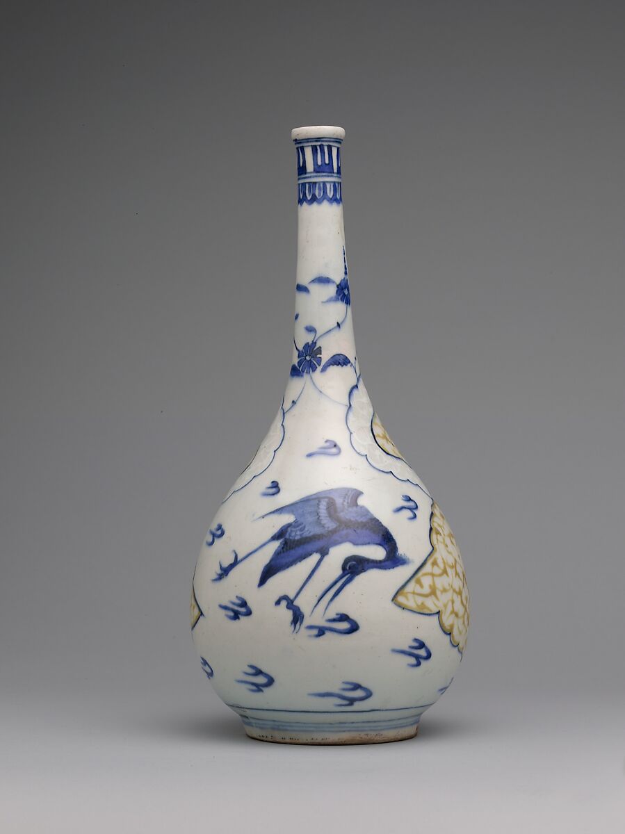 Ceramics produced in Kirman in the early seventeenth century consist primarily of stonepaste imitations of Chinese blue-and-white porcelains, decorated with cobalt in an underglaze technique. By the 1640s, a new style had developed in which elements loosely based on Chinese floral motifs were combined with locally developed devices, such as polychrome vegetal forms and medallions. Chinese in shape, this bottle could have been used as a rosewater sprinkler or decanter.