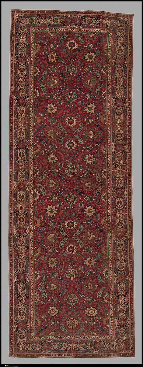 The characteristic red of Indian carpets emphasizes the graceful yet dynamic design of the trellis pattern connecting the floral and serrated motifs. The serrated leaves enclosing a palmette, as well as the medallions and cartouches in the border, recall sixteenth century Herat carpets from Iran, but the exuberance of the floral forms and richness of color confirm an Indian origin.