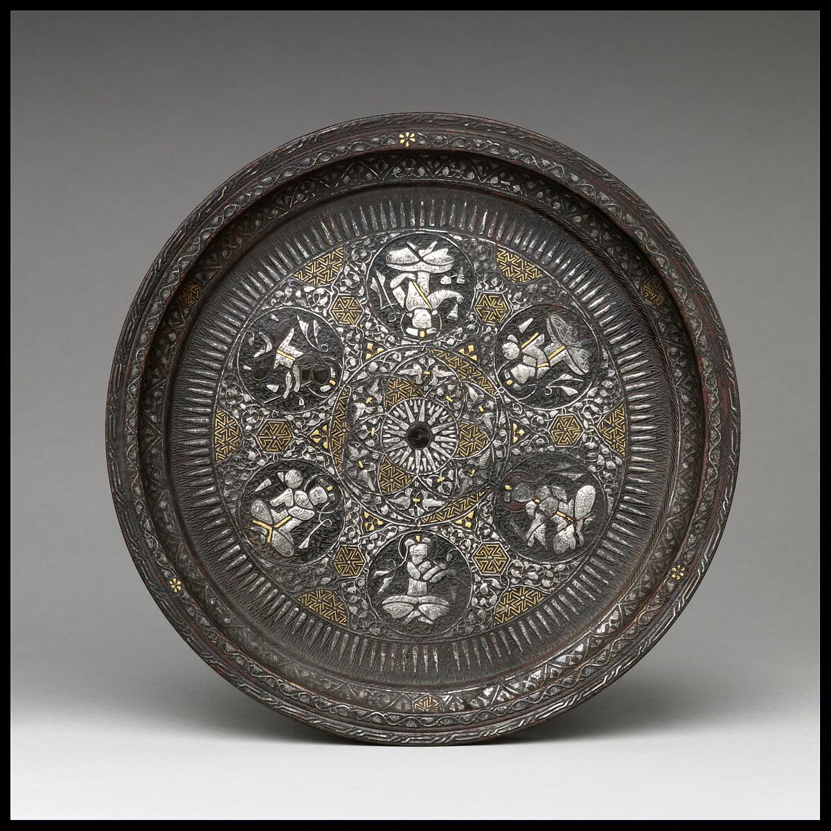 - Medium: Brass; cast, chased, engraved, inlaid with silver and gold