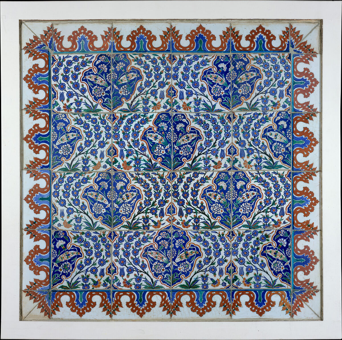 The tiles used in this panel are products of the Iznik kilns. Situated within forty miles of the Ottoman capital city of Istanbul, the ceramic workshops of Iznik began producing ceramic tiles for the Ottoman court in the early part of the sixteenth century. An explosion of Iznik tile production occurred in the mid‑sixteenth century, stimulated by a surge of royal building in Istanbul supervised by the celebrated Ottoman architect‑in‑chief, Sinan. Colorful, repeating-pattern Iznik tiles such as these still enliven the walls of mosques and palaces throughout Istanbul.