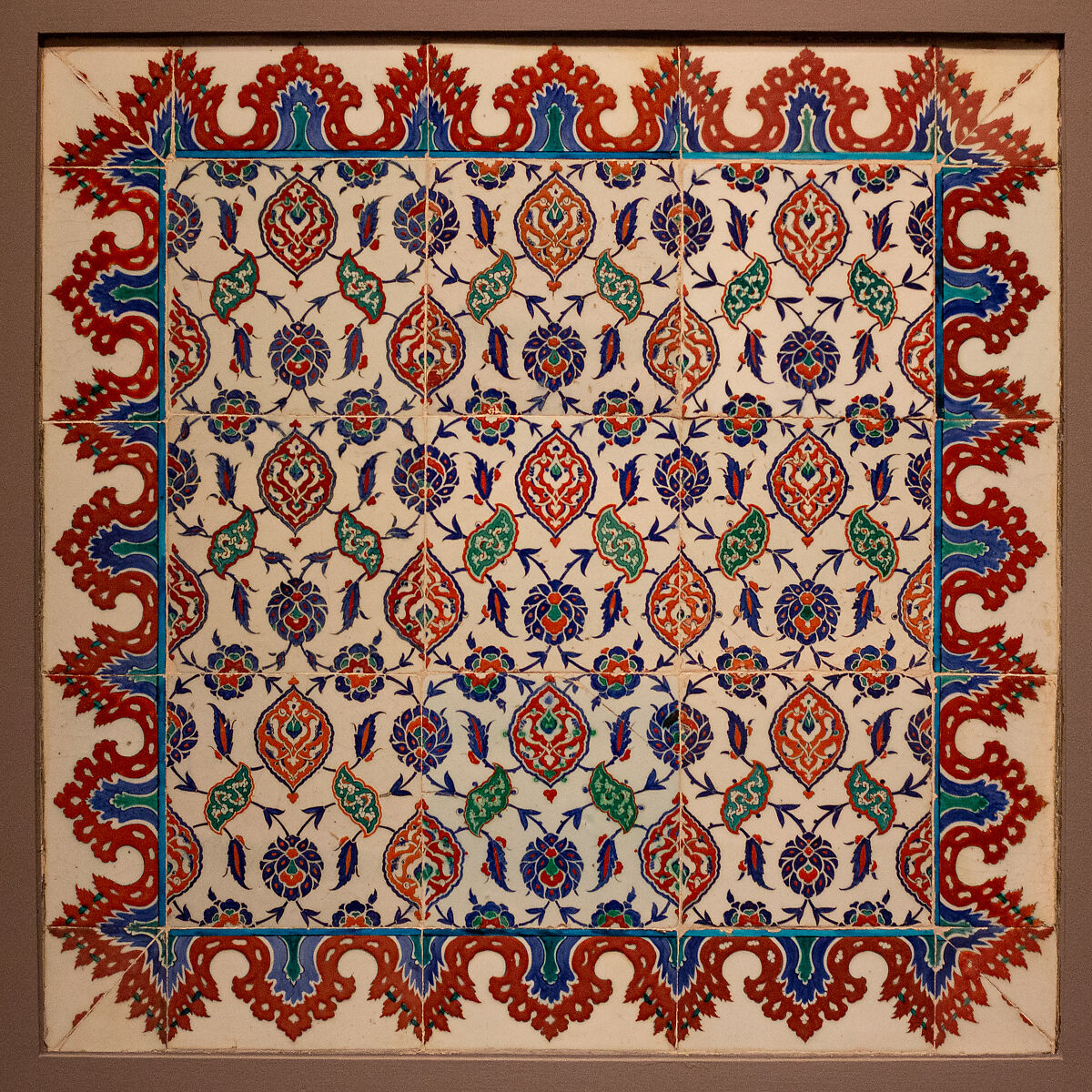 The tiles used in this panel are products of the Iznik kilns. Situated within forty miles of the Ottoman capital city of Istanbul, the ceramic workshops of Iznik began producing ceramic tiles for the Ottoman court in the early part of the sixteenth century. An explosion of Iznik tile production occurred in the mid‑sixteenth century, stimulated by a surge of royal building in Istanbul supervised by the celebrated Ottoman architect‑in‑chief, Sinan. Colorful, repeating-pattern Iznik tiles such as these still enliven the walls of mosques and palaces throughout Istanbul.