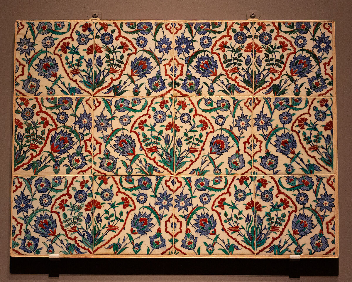 The tiles used in this panel are products of the Iznik kilns. Situated within forty miles of the Ottoman capital city of Istanbul, the ceramic workshops of Iznik began producing ceramic tiles for the Ottoman court in the early part of the sixteenth century. An explosion of Iznik tile production occurred in the mid‑sixteenth century, stimulated by a surge of royal building in Istanbul supervised by the celebrated Ottoman architect‑in‑chief, Sinan. Colorful, repeating-pattern Iznik tiles such as these still enliven the walls of mosques and palaces throughout Istanbul.