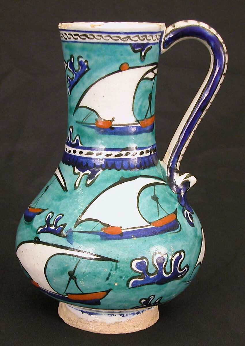 The lateen-rigged ships here are painted in a loose, almost freehand style on a green ground popular in seventeenth-century wares. The ubiquitous cloudlike motifs that drift between the ships also appear on many animal jugs and tankards.