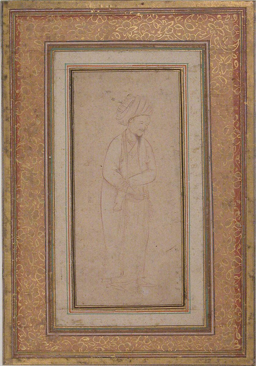 This exceptionally fine drawing in red ink contains an all-but-faded signature, "Riza", below the figure’s feet. The delicate style of the draughtsmanship, with lines of varying thickness and the hooked splutter of the pen to denote the fringe of the figure’s waist sash conform to Riza’s style of draughtsmanship from about 1590 to 1600. The figure’s Central Asian facial features suggest that he was one of the pilgrims that Riza observed when he accompanied Shah ‘Abbas I on his pilgrimage to Mashhad in 1598.