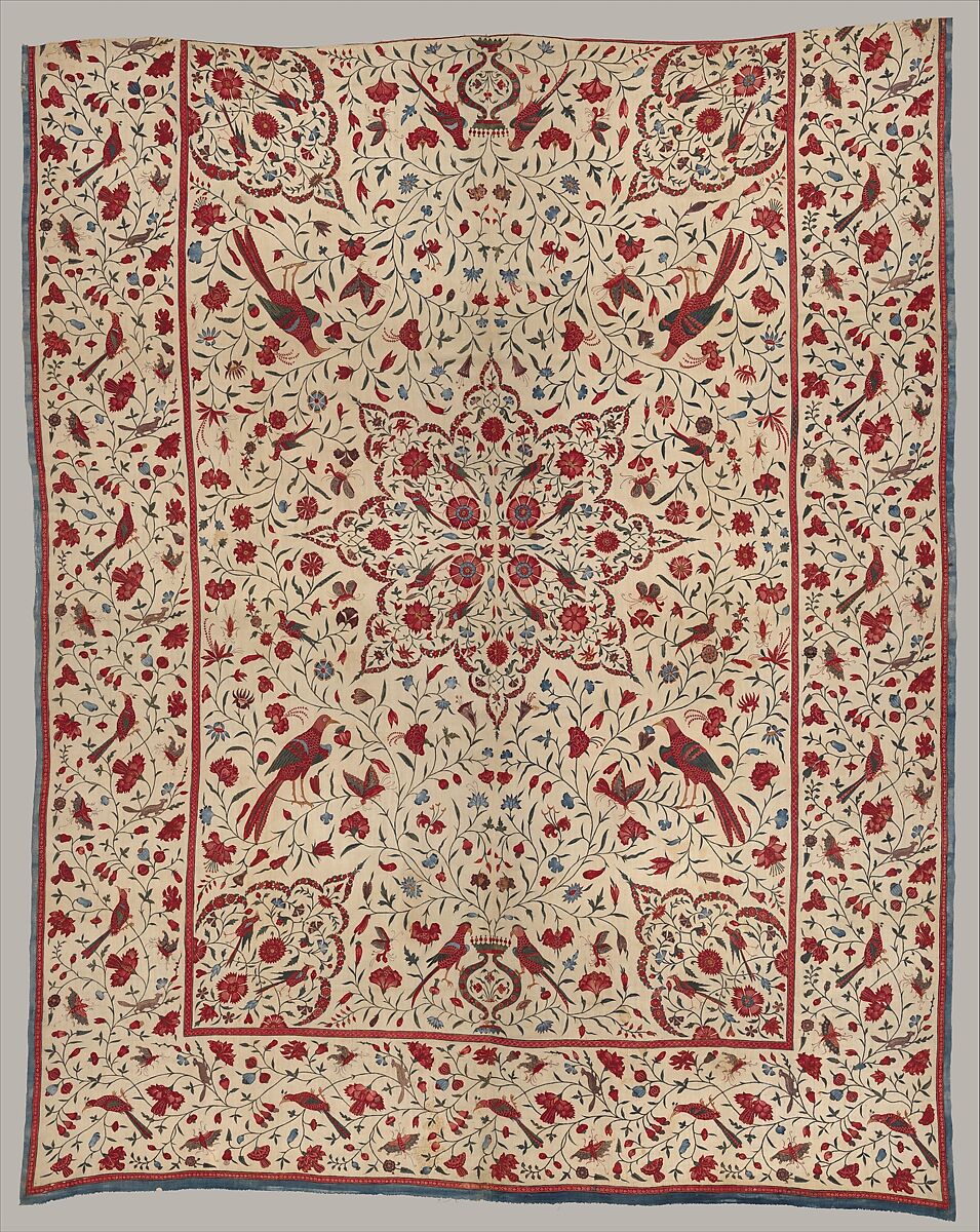 A technique called kalamkari was used in the production of this hanging fabric. In this multi-step process, each color is applied with a stylus or by using wax resists before the entire cloth is submerged in a dye bath. Although most of the decoration was printed in a less labor-intensive method, accents were created using this distinctly Indian process. The naturalistic but controlled treatment of the plants and animals seen here was typical of works created for the European market.