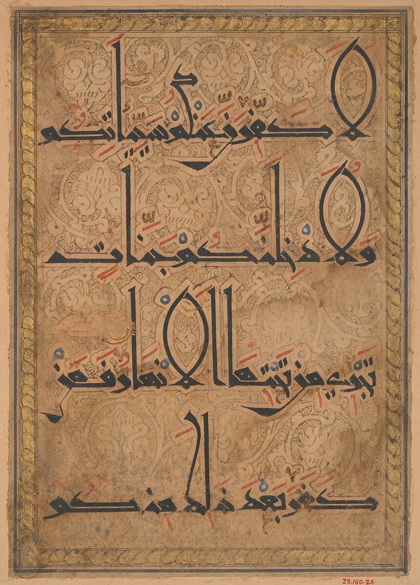 This folio from a dispersed Qur'an exemplifies the transition during the Seljuq period from Qur'ans written in kufic script on parchment to those copied in the more rounded new-style writing on paper. By the late twelfth century, the practitioners of the new style had perfected its mannered, slightly eccentric forms. As seen here, these include the extreme elongation of tall letters and the ellipse formed by combining two of these letters, lam and alif.