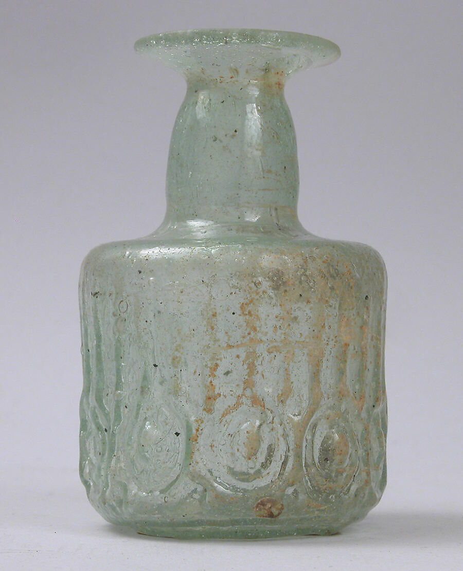 The decoration on this bottle, concentric circles topped by vertical ribs, is unusual in glass. The closest parallels to this pseudo-architectural pattern are found on fragmentary friezes in plaster excavated at the Abbasid palace at Samarra, Iraq (mid-9th century) whence it spread throughout the Islamic world.