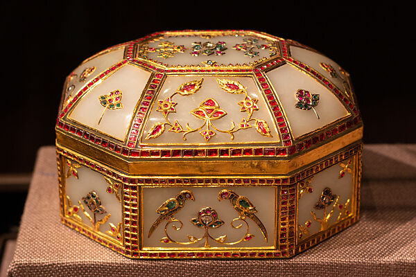 This small green and white jade casket is adorned with groups of jeweled parakeets, peacocks, and flowers outlined in inlaid gold. Jade working is an exceptionally time-consuming process that requires a great deal of skill due to the hard and brittle nature of the stone. Highly skilled artisans of the Mughal Empire carved works like this example from jade that they then inset with precious gems. These objects, decorated with floral motifs favored by the Mughal elite, were often exchanged as gifts.