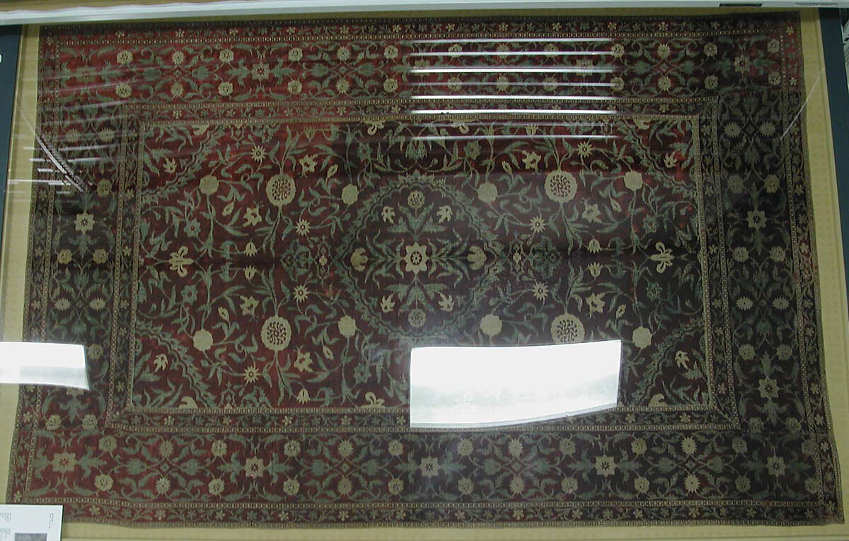The design of this velvet hanging is organized as it would be on a carpet, with a central and corner medallions, guard borders, and a main border. For special occasions, Mughal palaces and pavilions were spread with silk hangings, carpets, and velvets such as this.