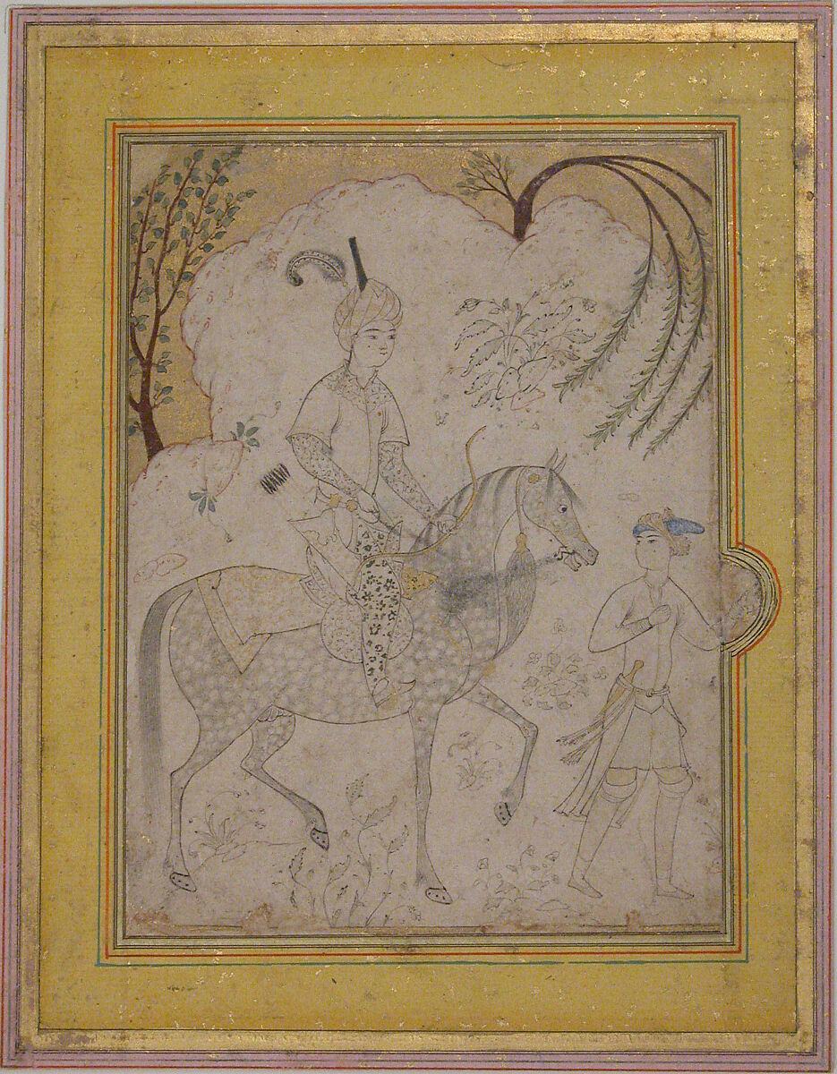 This drawing is most likely an early 20th–century work in the style of the mid-16th century. The tree at the upper right is atypical of the period; the Safavid taj is out of keeping with the Qazvin–style face of the horseman; the bit of the horse is also atypical of 16th–century Safavid horse furniture. Figures lacking mouths like the groom at the right appear in modern drawings, paintings and lacquerware produced in the Safavid style. Even the regularity of the dappling of the horse points to a modern date.