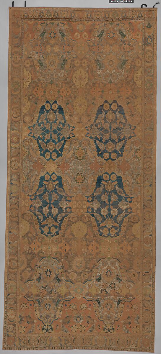 When, in 1878, a carpet similar to this one was exhibited in Paris, it was assumed that the coats of arms woven into the rug were Polish and that the rug was made in Poland. It was later recognized that this group, distinguished by a silk pile and metallic brocading, was Persian, made during and after the reign of Shah 'Abbas I, beginning around the end of the sixteenth or early seventeenth century. The name, however, persisted, and more than 200 examples still bear the name. Many pairs of the type also survive.