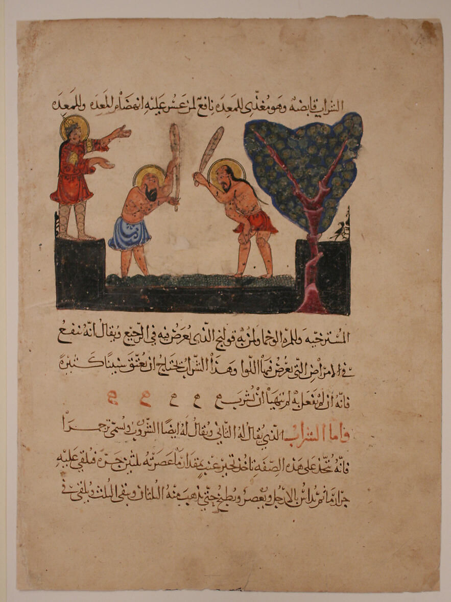 Illustrations in early Islamic manuscripts produced by the Baghdad School were greatly influenced by Greek and Byzantine prototypes; the text often included the translation of Greek scientific manuscripts, such as De Materia Medica, accompanied by detailed genre scenes. On this folio, the medicinal properties of sour wine are described with an illustration showing two men treading grapes.