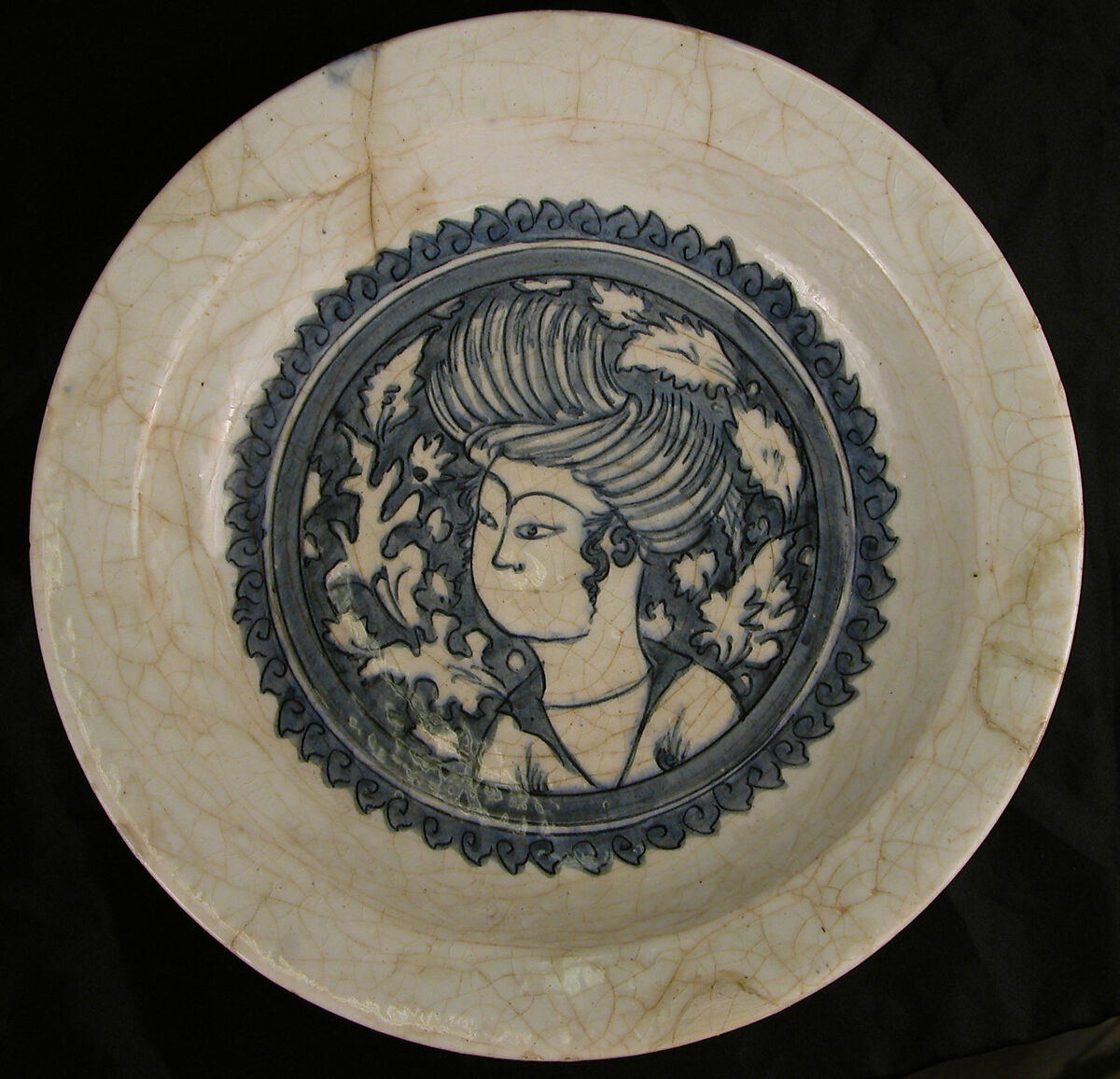 This dish belongs to a group of ceramics known as Kubachi ware. Named for a village in the Caucasus where this pottery was discovered in quantity, Kubachi wares are now thought to have actually been produced in Tabriz. One attribute of the Kubachi style is an uneven application of the glaze that has resulted in a surface-wide crackle. Dirt has seeped into the cracklure, discoloring the underlying body to a brownish tint.