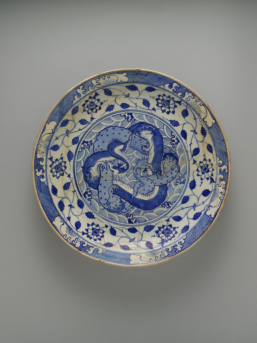 The designs on this large dish adapt elements of Chinese blue-and-white porcelain of various dates. The center of the dish is densely ornamented with two entwined dragons, one light blue and the other dark blue with a white underbelly, grappling with each other against a concentric wave pattern. The cavetto zone surrounds this scene with a band of lotus flowers linked by delicately scrolling vines and leaves. The rim bears a reserve-painted wave-and-rock pattern and the exterior is decorated with scrolls of wispy and fanlike floral forms. On the foot of the dish is a "tassel mark" in imitation of a Chinese reign mark, or nien-hao. Similar marks are found on other bowls attributed to seventeenth-century Iran.