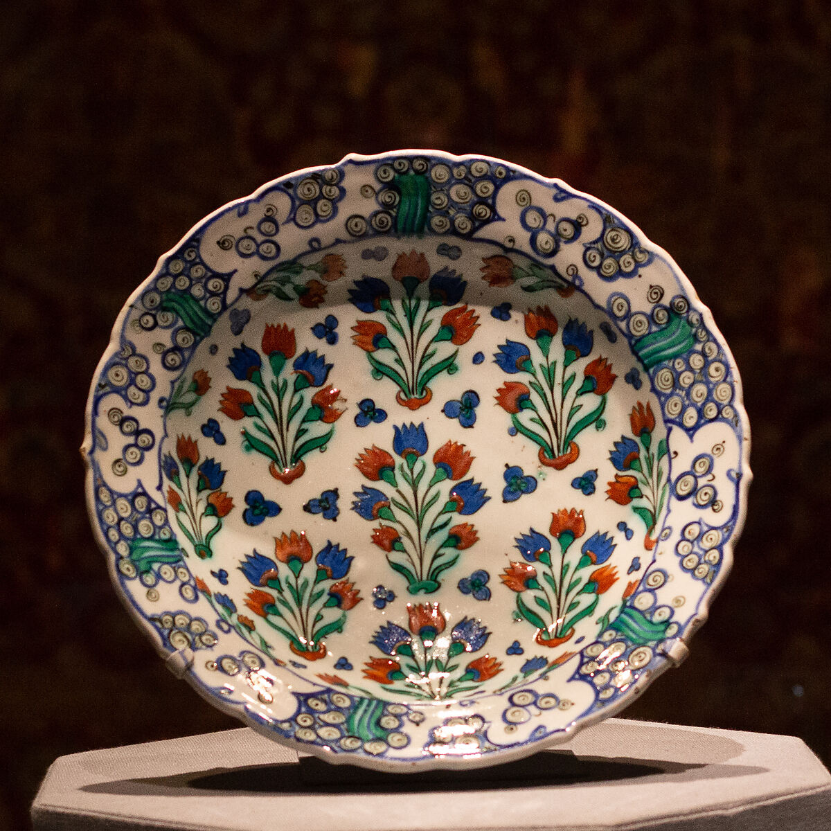The dish has a flattened base, a flat, scalloped rim, and stands on a foot ring. It is decorated with an over-all pattern of tulips arranged in staggered rows. Between these flowers there are çintamani or triple dot motifs. Spiral-like motifs have been painted on the rim.