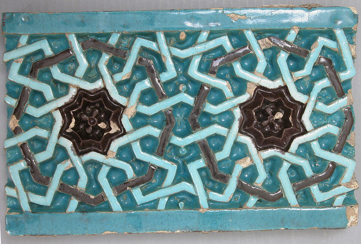 This tile was probably part of a frieze that once decorated the mausoleum of Buyan Quli Khan in Bukhara; he died in 1358. Tiles with deeply carved geometric designs glazed in one or more colors are typical of buildings in Bukhara and Samarqand of the second half of the fourteenth century. A simplified pattern can be read by focusing on the large dark-colored octagon motifs: repeated twice, they each contain an eight-pointed star with a four-petaled rosette in the center. The interlaced design in turquoise, however, is at the heart of this spirited and succesful architectural decorative element, which is based on half-octagons with two open sides. The intricacy of the pattern seems intentionally to defy a proper geometric interpretation, allowing the eye to wonder and the observer to wonder if a metaphysical explanation should be sought instead.