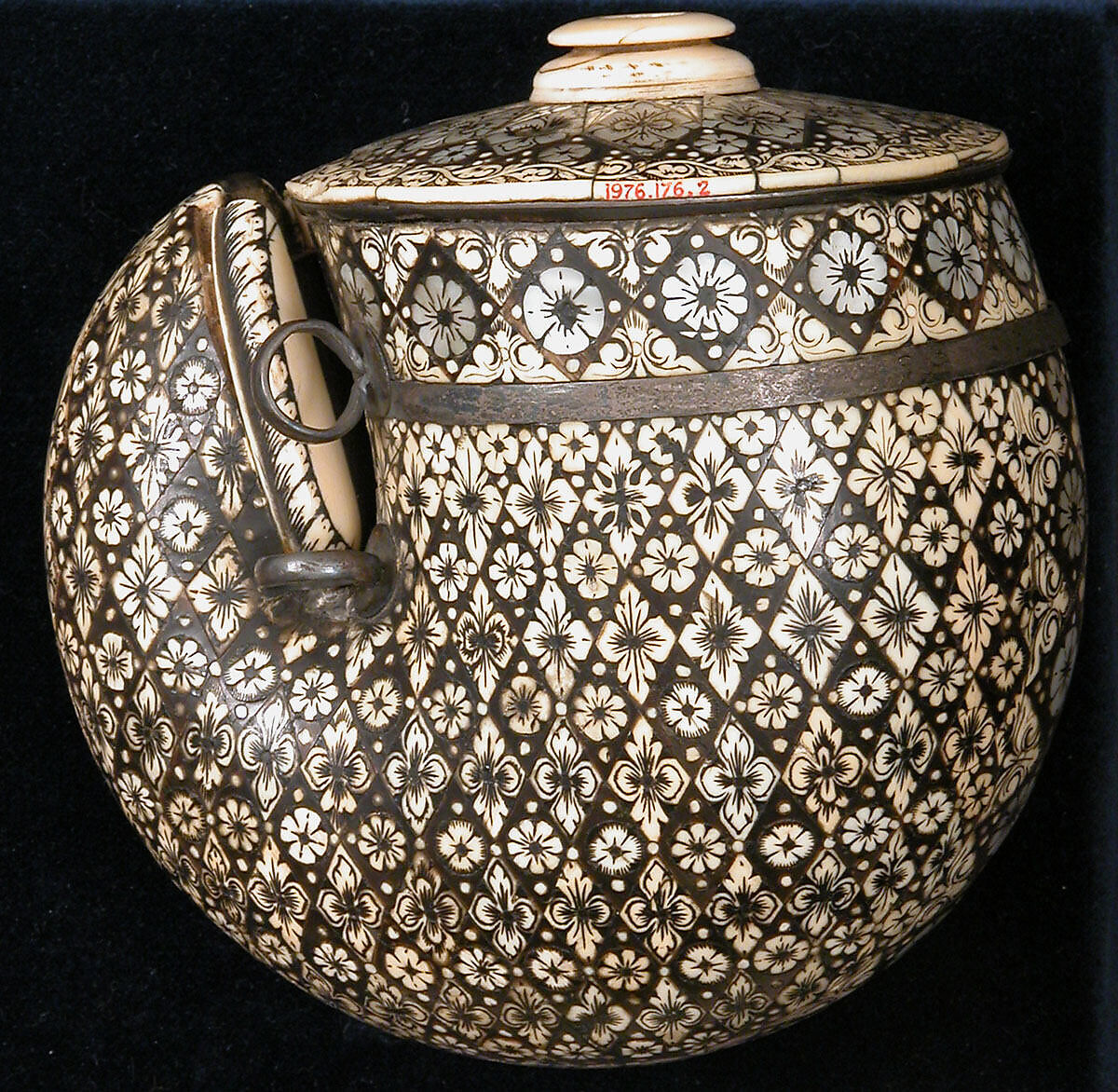 A powder horn, which typically was made of cow or buffalo horn, refers to any personal container that was used for gunpowder. This flask is made of wood, but shaped to resemble a nautilus shell. The floral decoration that makes up the body is inlaid with horn, mother of pearl, and ivory. The two silver hooks would have attached to a strap worn over the shoulder, allowing the user to easily access the gunpowder by lifting the lid off the top.