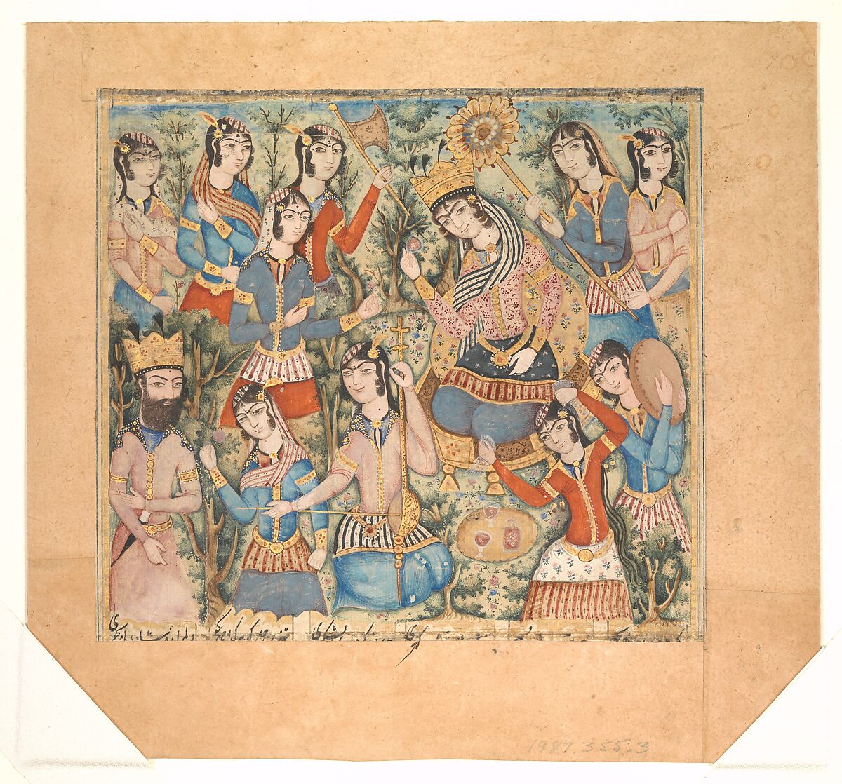 This illustrated folio was probably cut from its original illustrated manuscript as a line of text appears along the bottom edge of the leaf. The image depicts a group of female attendants, musicians, and dancers surrounding a crowned central female figure who kneels on a golden throne. A crowned male figure kneels at the lower left. One attendant on the queen's right holds a traditional axe-shaped fan, while the attendant on her left holds a fan in the shape of a sunburst, often a symbol of imperial power. All the female attendants and musicians wear a striped cap which allows us to date the painting to around 1800. The subject matter of the painting and the manuscript from which it comes cannot be securely identified. Some scholars have identified it as Solomon and the Queen of Sheba, while others have suggested it is a folio from the Garshaspnama depicting Jamshid and Parichehr.