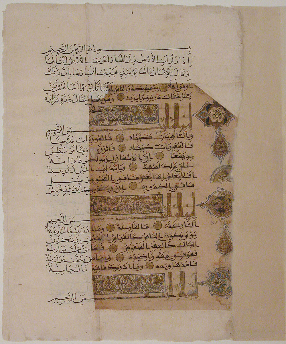 Eight folios of this dispersed Qur'an are held in the Museum collection. Among these folios is the colophon page, with the signature of the scribe Muhammad al‑Zanjani from the town of Zanjan, in northwestern Iran, and the date of completion, 531 AH/1137 CE. The text is written in the script known as eastern kufic with some elements in cursive (naskh), and is lavishly illuminated with designs of foliate scrolls and geometric interlace.