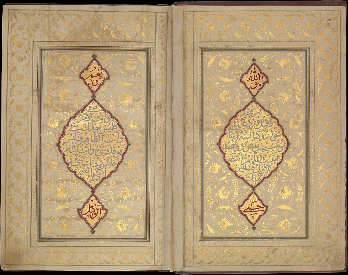 This prayer book reflects the fusion of Indian and Iranian manuscript illumination in the eighteenth century. It contains the Surat al-Yasin and the Surat al-Fath (Victory) copied by the celebrated master of revival naskh, Ahmad Nairizi, with illuminations attributed to the renowned Muhammad Hadi. The color palette and decoration of naturalistic grape-bearing vines and vegetal scrolls in vibrant gold, pistachio green, and crimson resemble designs used in Mughal and Kashmiri manuscript illumination, architectural decoration, and decorative arts.