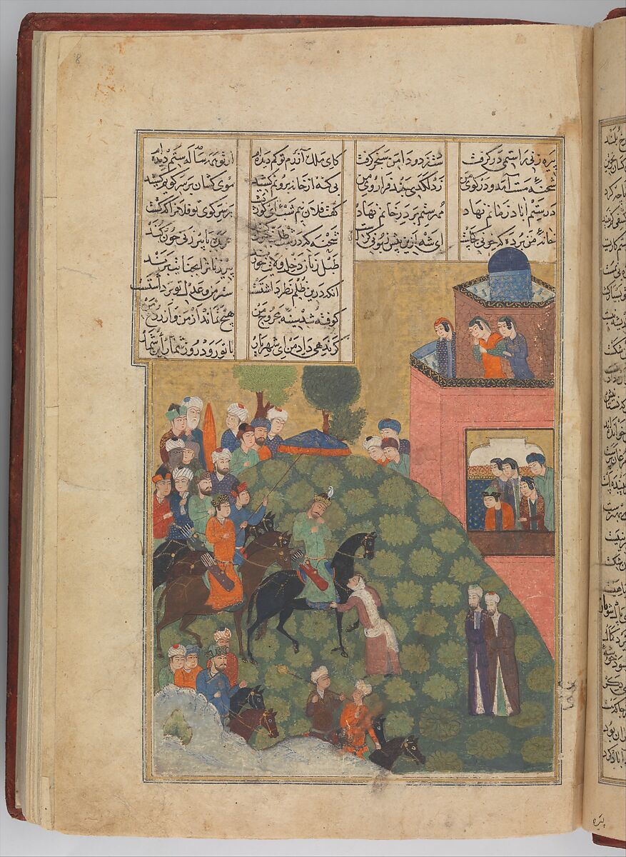 By the end of the fifteenth century, manuscripts of Persian poetry typically were written in a script known as nasta'liq, an elegant, flowing form of calligraphy. This manuscript is somewhat unusual in its archaizing use of the more rectilinear naskh script. Nevertheless, the paintings of this manuscript are stylistically akin to those found in manuscripts produced in Shiraz during the reign of Sultan Khalil Aq Quyunlu (d. 1478), suggesting that it was copied under an earlier patron, but illustrated in the Aq Quyunlu period.