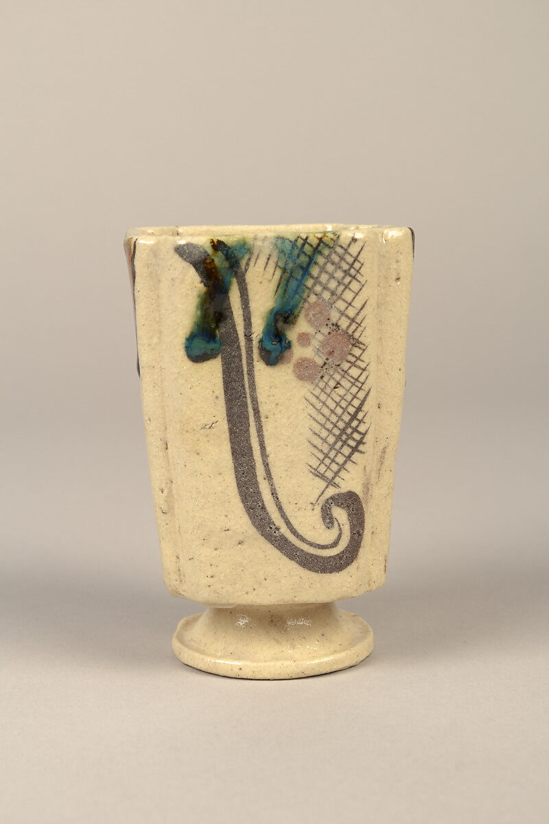 These unique vessels (1973.80.1–5,) used to serve kaiseki meal prior to the whipped green tea, were inspired by imported wine glasses. They were formed on the wheel and then molded into four-sided shapes before being decorated with V-like motifs, fern scrolls, crosshatching, and plum blossoms against a white slip ground. The glaze drips and variations of the motifs reveal an appreciation of spontaneity.