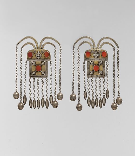 - Medium: Silver, fire-gilded with gallery wire, stamped bead and applique decoration, rams' heads upper terminations, link chains, bells, embossed pendants and table cut carnelians