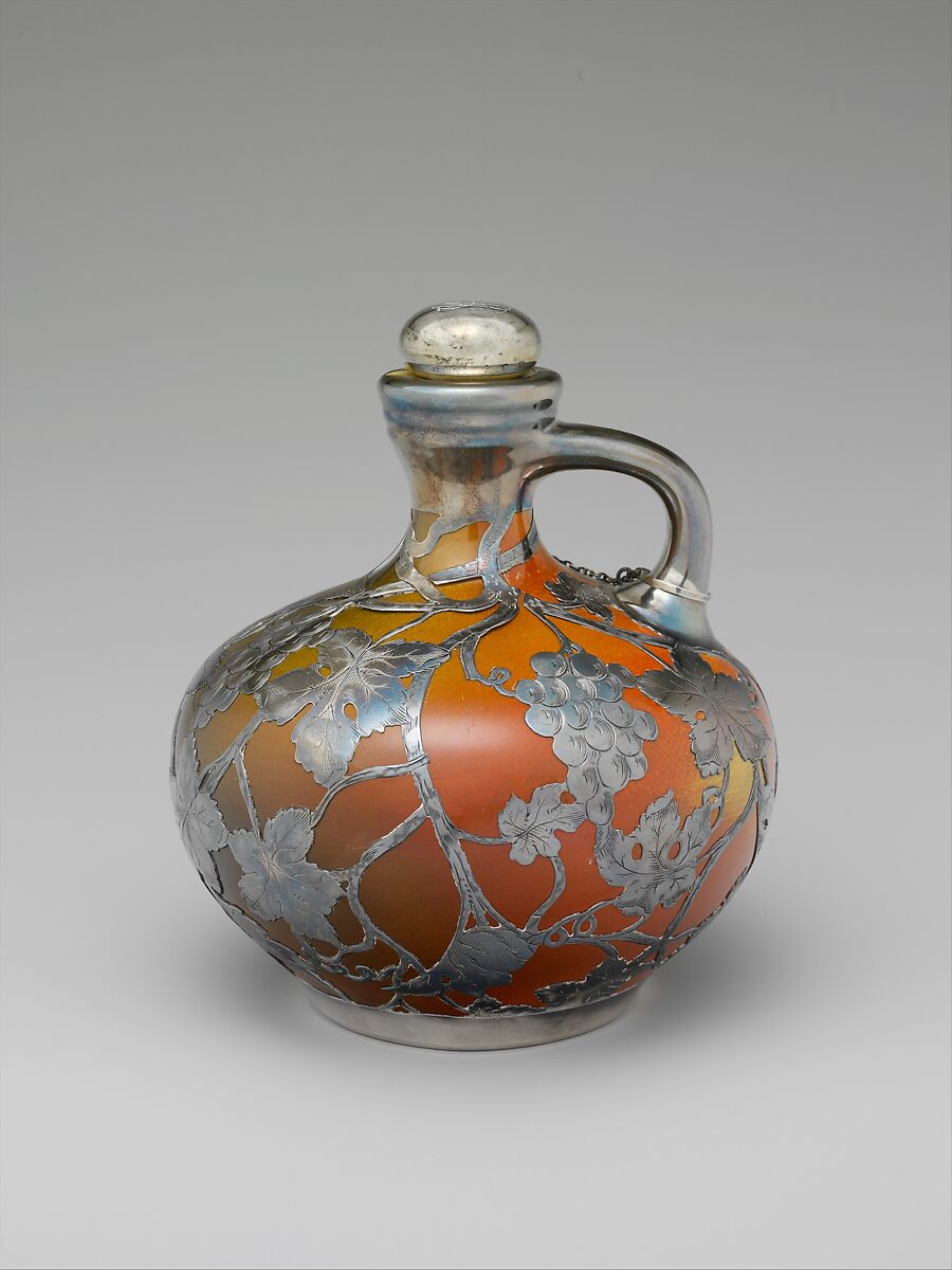 This jug is skillfully decorated with corn husks under a Standard glaze, embellished with a silver overlay design of grapes and grapevines. The Gorham Manufacturing Company in Providence, Rhode Island, applied silver overlays on Rookwood Standard glaze objects from 1892 to 1893. Rookwood had no control over the silver designs, and the venture was not considered critically successful. For another example of this technique, see 69.37.2. The American Wing has additional examples of Rookwood Pottery, see 43.67, 45.147, 69.17, 69.37.1, 69.37.2, 69.37.3, 1973.93, 1980.452, 1980.453, 1981.443, L.1999.101, 1991.214, and 1991.335.