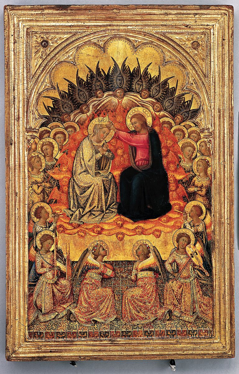 Information on Niccolò di Buonaccorso (active 1356, d. 1388) is sparse, but this 'Coronation of the Virgin' is thought to be part of a portable altarpiece he painted circa1380. Two other panels with scenes from the life of the Virgin in a similar style and size and with similar frames are in the Uffizi, Florence and the National Gallery, London. The engaged frame on the Lehman panel has an intact patina. The London frame, unfortunately, no longer has its original surface. On all three frames there is no frieze between the ogee on the top edge and the cavetto on the sight edge of the principal molding, though the pastiglia spandrel give the sense of one. The outer molding supports the cusped pastiglia arch with a strength usually seen in tabernacle frames with pilasters. On the Florence and London panels the arch reflects the architecture depicted in the painting. On the Lehman panel the cusps repeat the curves of the concentric circles of the angels' halos. Unusually, the outer edges of the Lehman frame are silvered and punched. The backs of all three panels are decorated with an identical pattern of diamon-shaped lozenges painted in blue and red on silver.