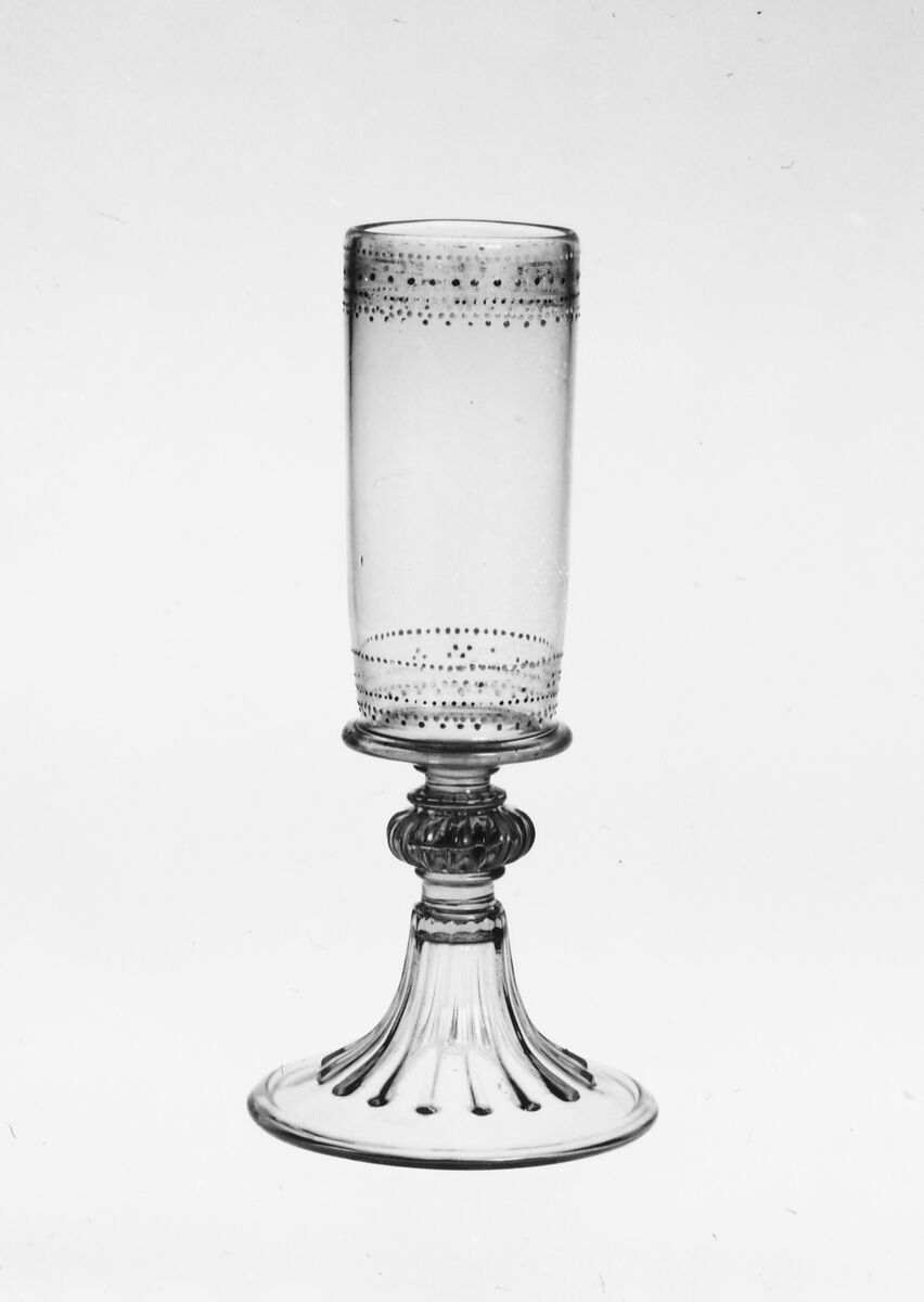 - Medium: Colorless (slightly grayish tan) nonlead glass. Blown, pattern molded, enameled, gilt.