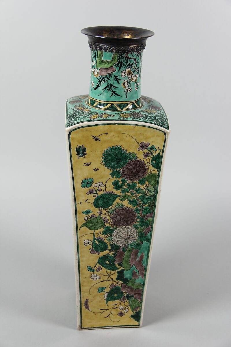 - Medium: Porcelain painted in polychrome enamels over a yellow ground (Jingdezhen ware, famille jaune), silver mouth rim