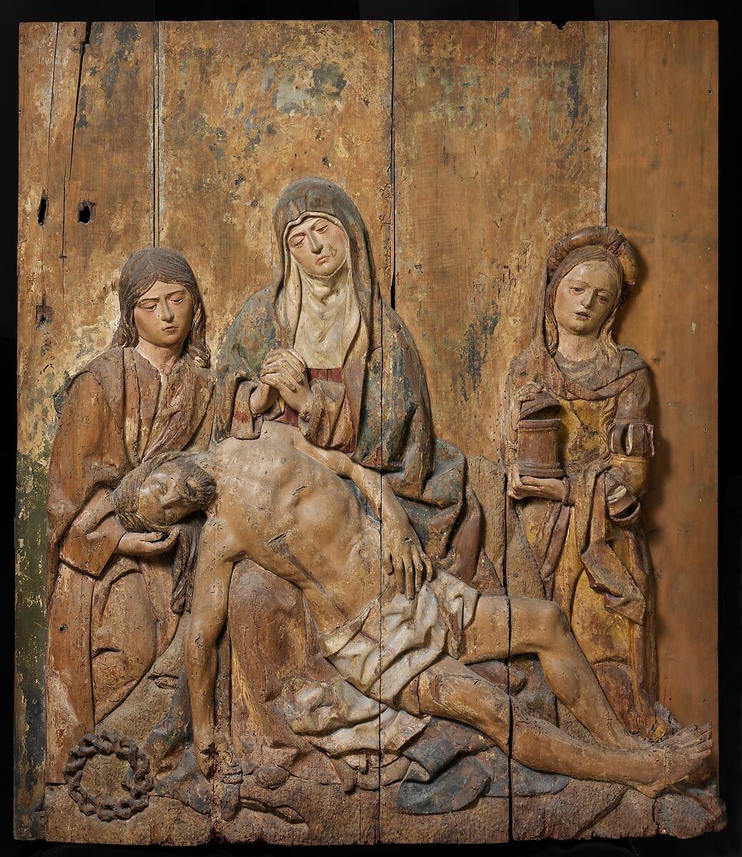 In this lamentation scene, Saint John and Mary Magdalene mourn with the Virgin Mary over the crucified Christ.