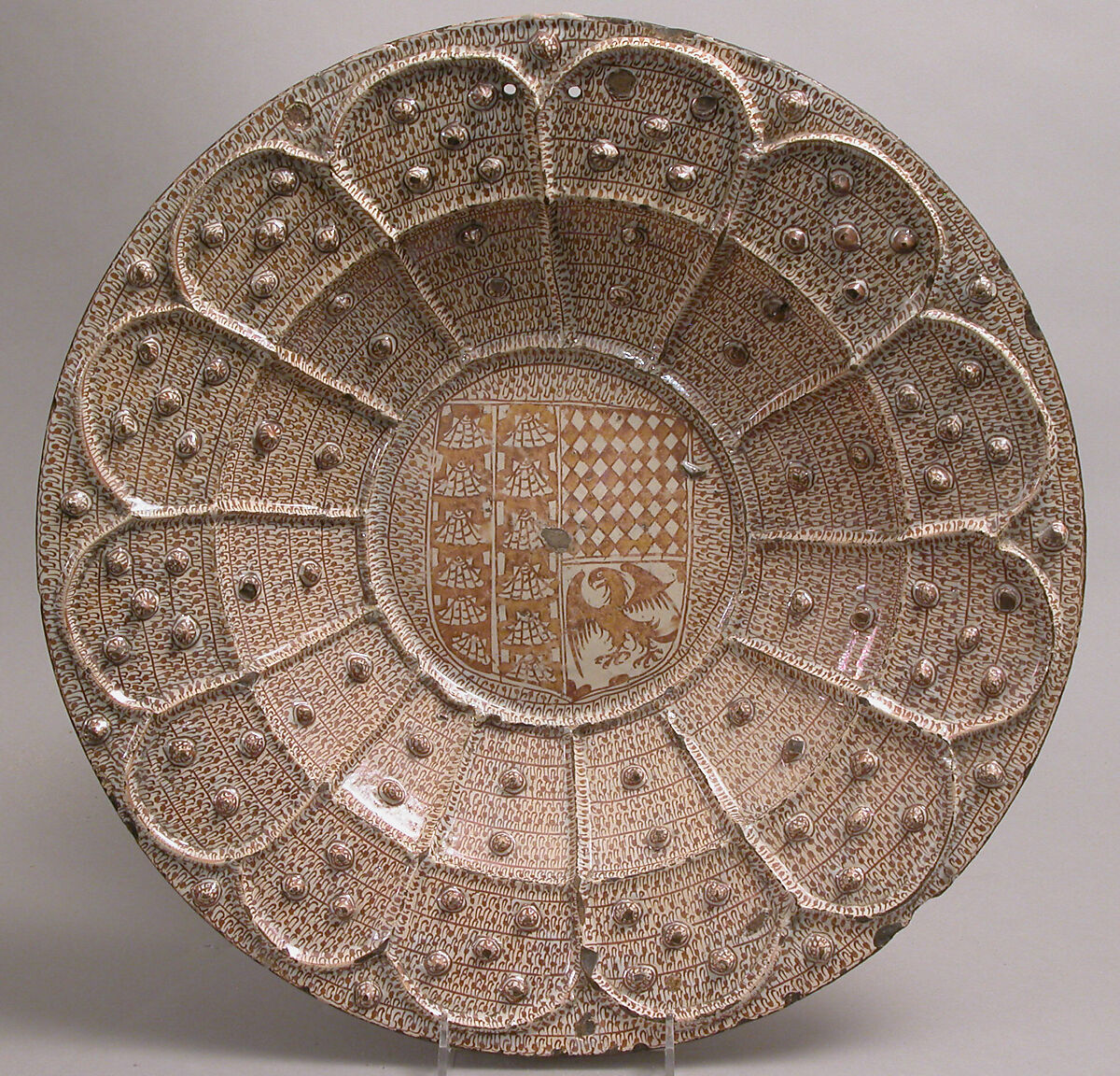 Toward the end of the fifteenth century, Valencian potters created new forms, modeled after contemporary metalwork, with raised studs and ribbing. These objects were often embellished with an overall dot-and-stalk pattern, which served as a field surrounding a family crest.