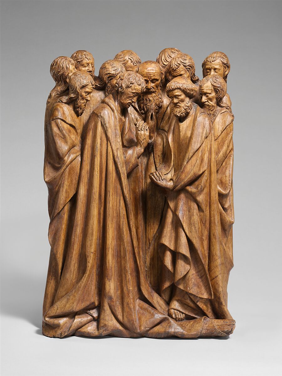 This relief depicts an episode from Christ’s final appearance, following the Resurrection, when he revealed himself to the apostles gathered in prayer. The work is stylistically related to the reliefs in the choir of the church of Notre-Dame at Hal, Belgium, which are dated 1409.