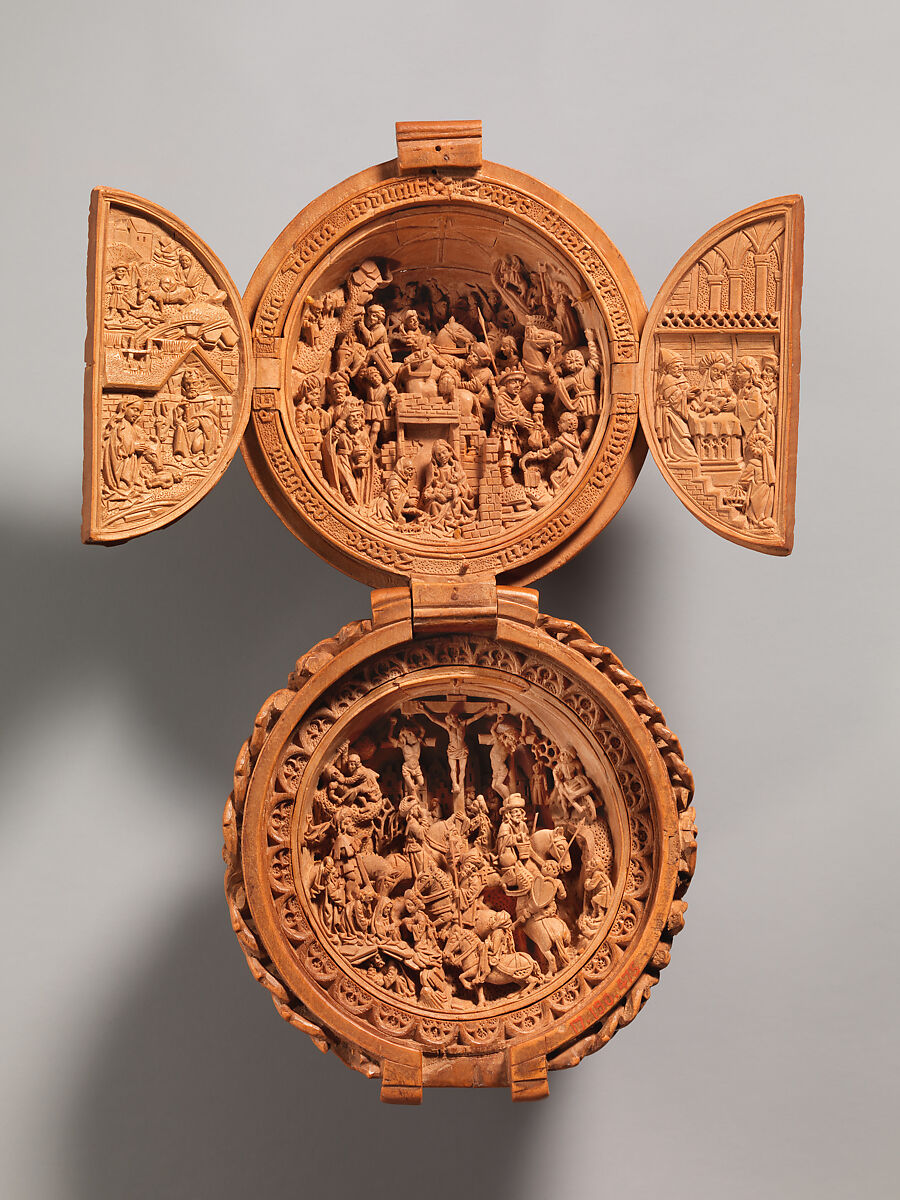 Carved with astonishingly minute detail, this rosary bead probably was created with the help of a magnifying lens. When opened, it forms a triptych. On the left is the Journey to Bethlehem and the Nativity; in the center is the Journey of the Magi, complete with horses and camels, followed by their Adoration of the baby Jesus and offering of gifts; and on the right is the Presentation of the Child in the Temple at Jerusalem. The Latin inscription is the text of Psalm 71:10, which refers to kings of Arabia and Saba and is associated by Christians with the Magi.