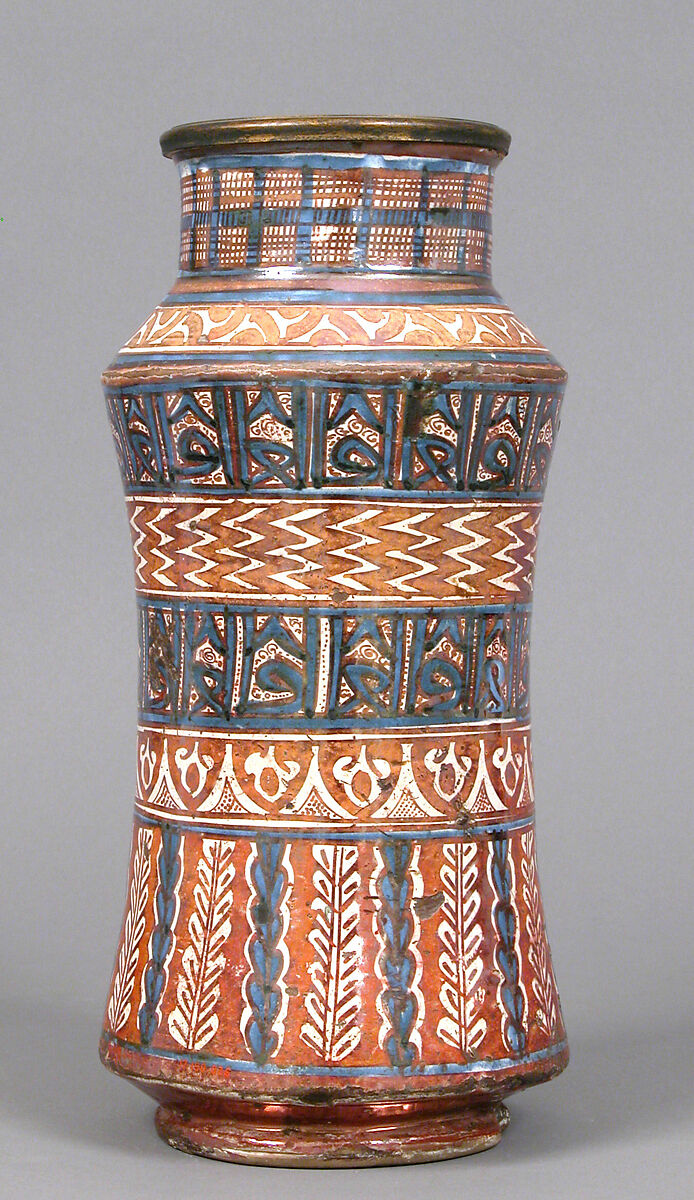This work is decorated with many of the motifs favored for pharmacy jars, including two bands bearing an alafia—a stylized inscription of the Arabic word for "health and happiness."