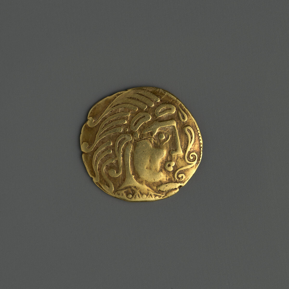 The Celts probably began striking coins in the 200s b.c. after receiving gold and silver pieces from Hellenistic kings who employed Celtic warriors as mercenaries. The coins seen here display motifs derived from Hellenistic coins—a head on one side and a charioteer and horse on the reverse—but their animated design conveys a Celtic aesthetic.