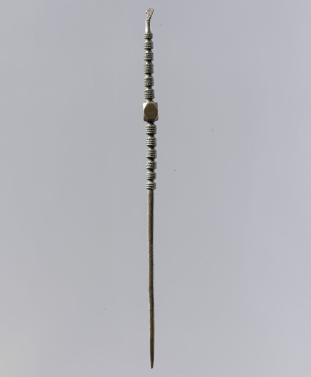 Pins were used to secure a veil or to hold a hairstyle in place. Most were made simply of copper alloy, sometimes tinned to look like silver, but some were elaborate objects, showcasing an array of metalsmithing techniques.