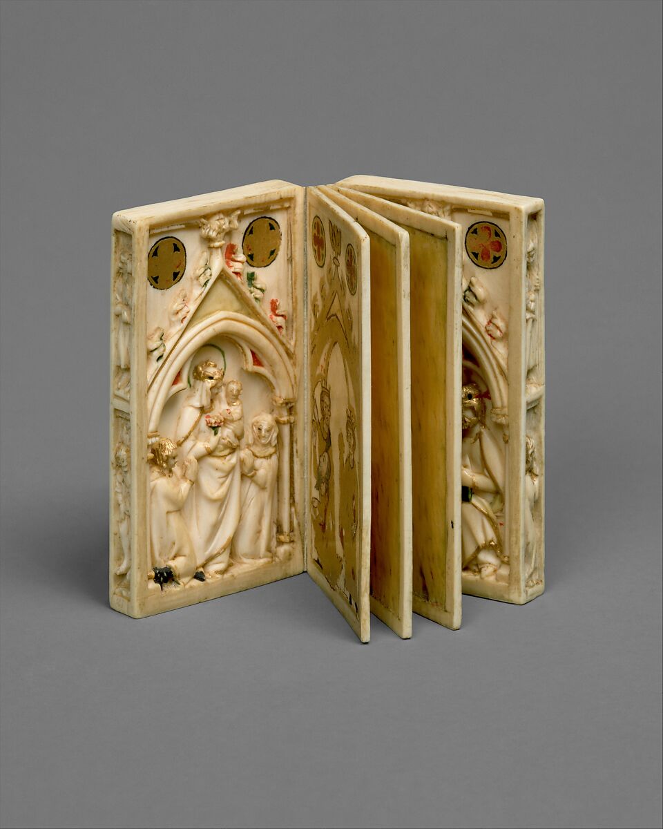 An exceptional ivory object, this diminutive booklet is unusual in that both the exterior covers, depicting scenes of the Passion, and the interior covers, containing representations of the Virgin, are carved. The religious nature of the booklet suggests that it served as an accessory for private devotion. The painted images facing the covers are later additions, since they transform the subjects of the carvings. Except for the two painted leaves, all have raised edges. Wax may have been applied to the surfaces, allowing prayers of intercession or litanies of saints to be inscribed on the tablets with a stylus.