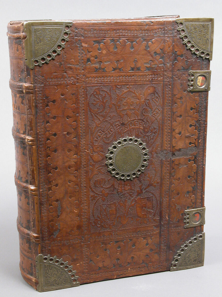 - Medium: Binding: leather (stamped & tooled) with engraved brass fittings, ink printed on paper, 1st folio hand colored in tempera, metal leaf, and shell gold