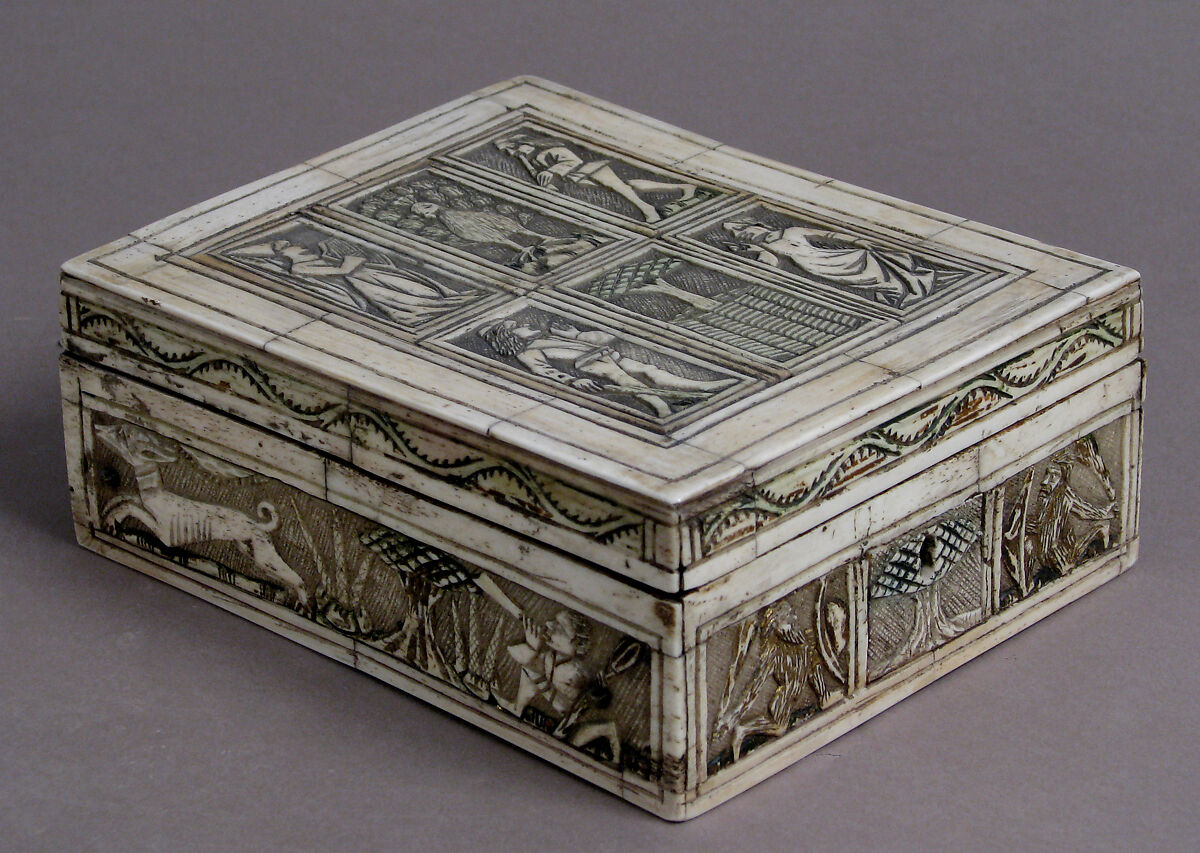 - Medium: Bone, traces of gilding and paint over wooden core with red silk interior, metal mounts