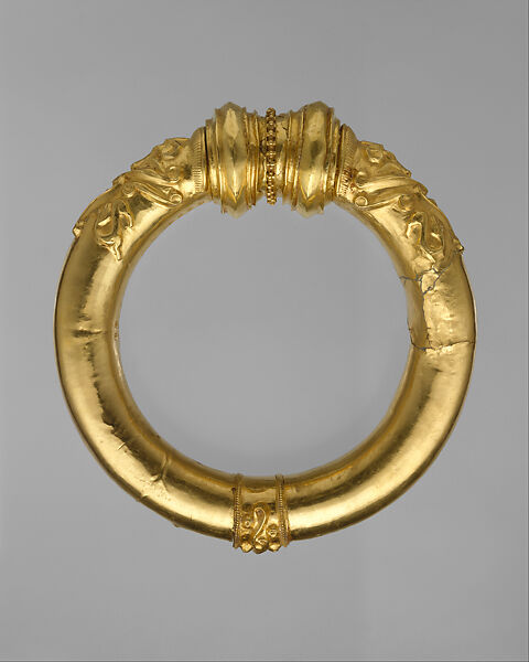 This work of art is currently on loan to the museum.[The Celts] amass a great amount of gold, which is used for ornament not only by the women but also by the men. . . . A striking practice is found among the Celts, in connection with the sacred precincts of the gods; for in the temples and precincts made consecrate in their land a great amount of gold has been deposited as a dedication to the gods, and not a native of the country ever touches it.