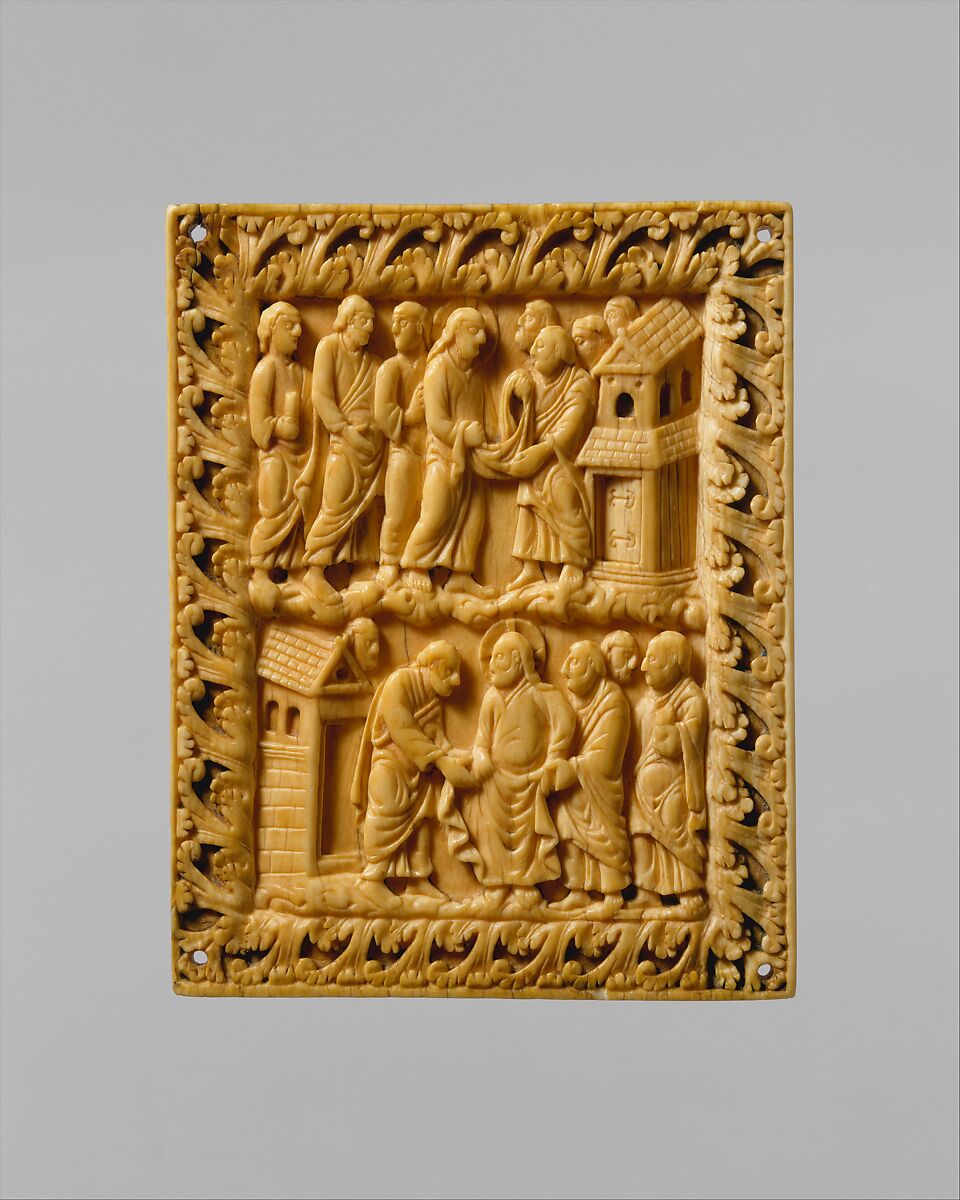 The story depicted on this ivory focuses on a garment that Jesus seems to be giving to an apostle and may refer to his charge to his apostles to continue his ministry. The ivory, which may have decorated a liturgical manuscript, can be associated with the court of Charles the Bald (r. 840–77), grandson of Charlemagne.
