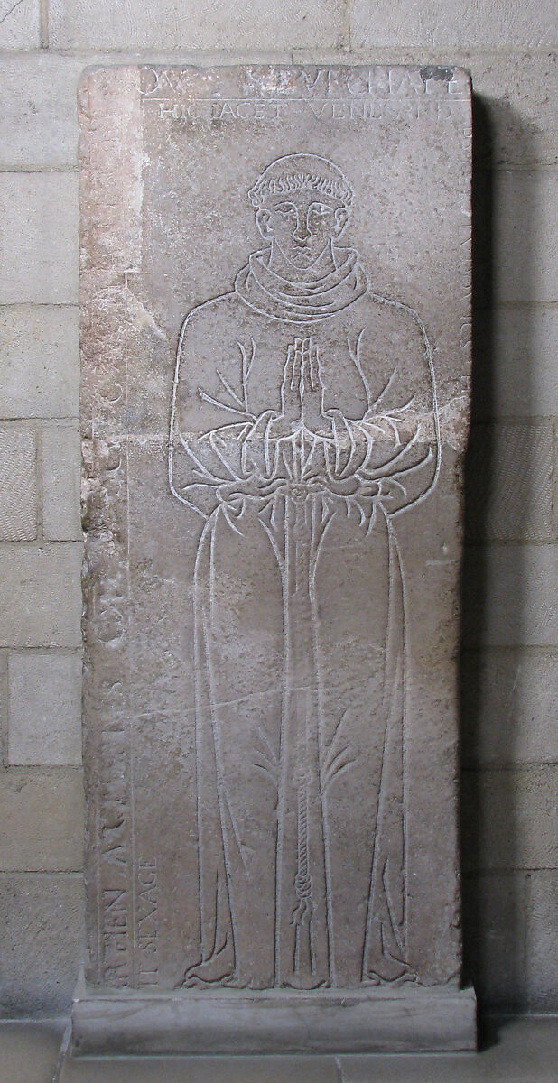 The knotted cord distinguishes this figure as a Franciscan friar. The legible part of the inscription, which may date later and thus suggests reuse of the tomb slab, provides his name: HIC IACET VENERAND PATER LVDOVICS (Here lies venerable Father Louis).