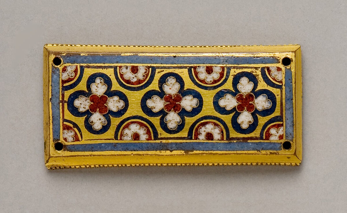 Although subtle variations of pattern and color distinguish these three plaques from one another, they once formed part of the decoration of a single reliquary. Roman numerals scratched into the reverse indicated where they were to be set, with other figural and decorative elements, on a large house-shaped shrine or other devotional object.