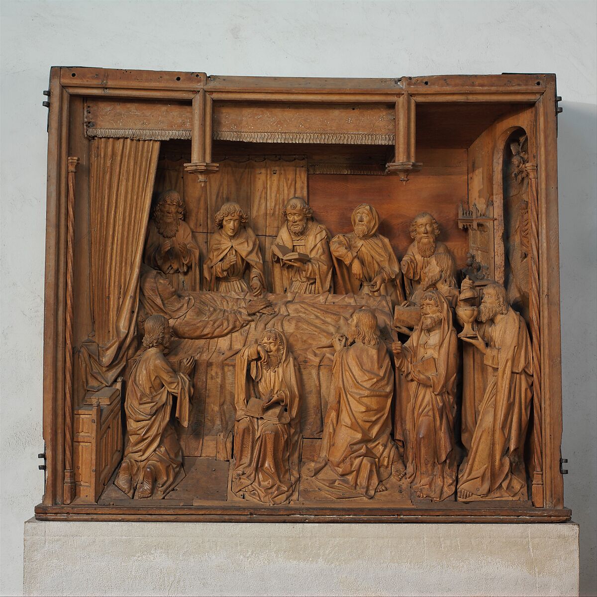 This high-relief sculpture, once painted, was the central scene of an altarpiece, the wings of which depicted the Birth of the Virgin and the Nativity. According to the Golden Legend, the twelve apostles gathered at the Virgin’s deathbed. Saint Peter, holding a book, officiates. Next to him, an apostle sprinkles holy water. At the foot of the bed, one apostle perfumes the air with incense. Saint Thomas is missing; according to legend he arrived too late and, characteristically, doubted the Assumption of the Virgin’s body into heaven until an angel dropped Mary’s belt down to him as proof.