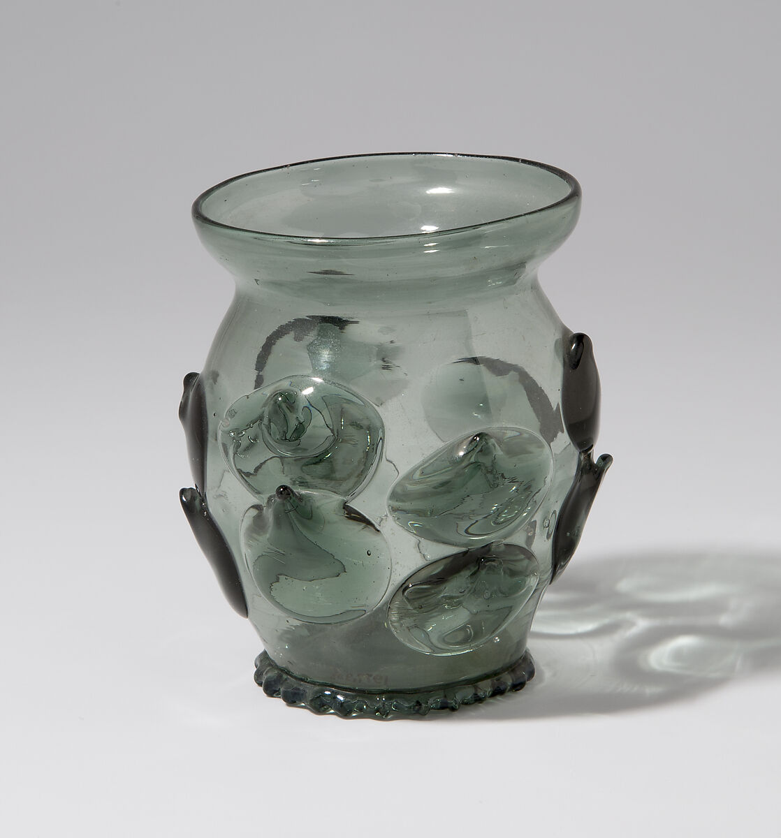 While intended primarily as drinking vessels, small beakers of this type were sometimes adapted as containers for sacred relics. Seals impressed into the wax used to cap the vessels often provide a means of dating them.